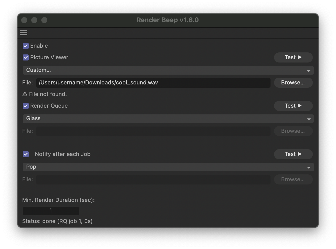 It works seamlessly with both the Picture Viewer and the Render Queue, giving you full control over notifications. You can assign different system sounds or even use your own custom audio for individual renders, each completed job, or the entire queue — and even set a minimum time interval between alerts, so you won’t be spammed with unnecessary notifications.